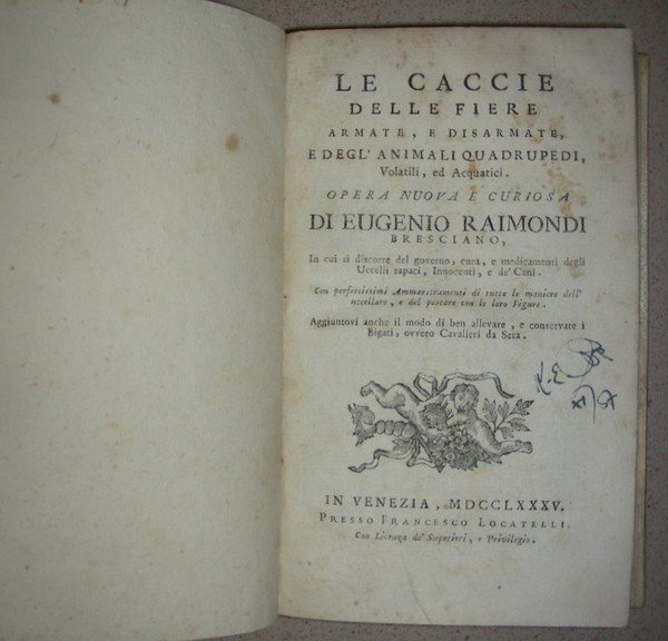 LE CACCIE DELLE FIERE armate, e disarmate, e degl’animali quadrupedi, volatili, ed acquatici. Opera nuova e curiosa di. Bresciano in cui si discorre del governo, cura, e medicamenti degli uccelli rapaci, innocenti, e de’ cani. Con perfettissimi ammaestramenti di tutte le maniere dell’uccellare, e del pescare con le loro Figure. Aggiuntovi anche il modo di ben allevare, e conservare i Bigati, ovvero Cavalieri della Seta.