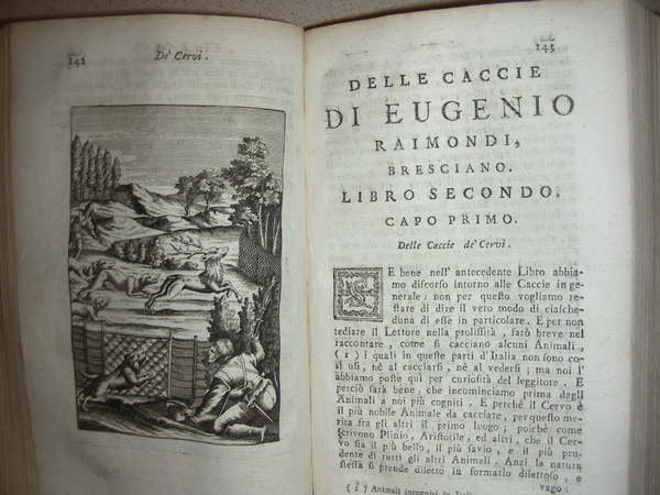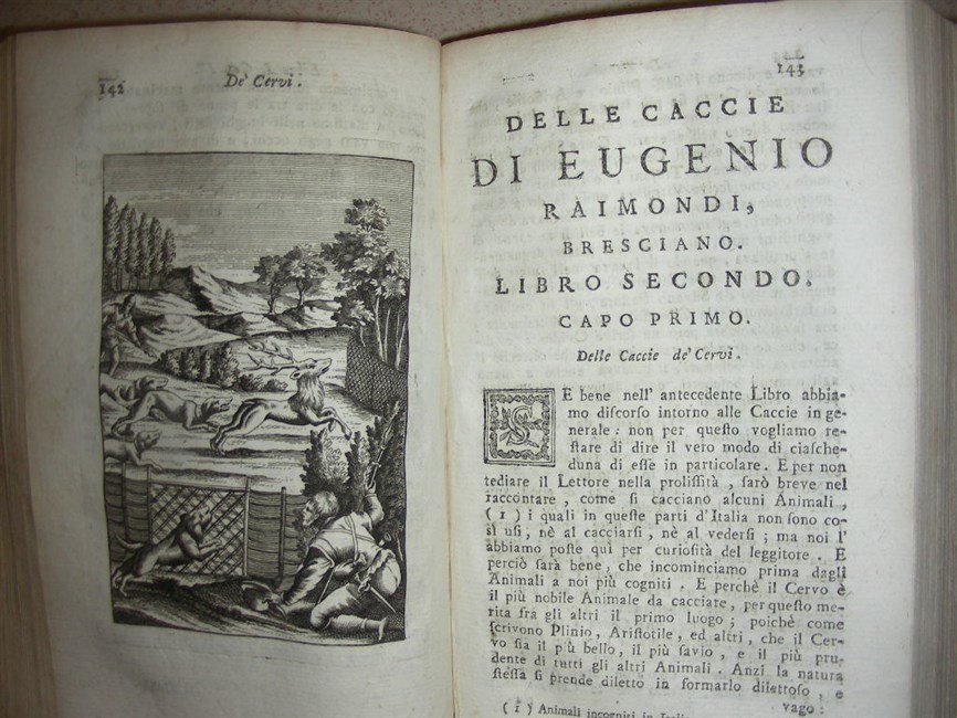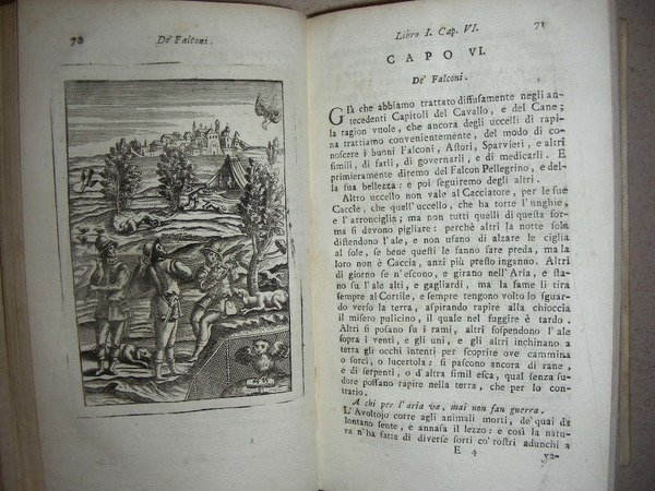 in-16, pp. 393, (4), bella leg. p. perg. coeva con tass. al d. Fregio xilogr. al front., testat. e final. Con 7 belle tavv. inc. in rame a p. pag. raffiguranti scene di caccia. Quinta ediz. del celebre trattato di arte venatoria con particolare approfondimento alla falconeria. Ceresoli p. 441: “Opera classica della caccia italiana”. Brunet I, 1090. Re, III, 273-274. Gamba 2061: “Il libro è zeppo di cose assurde e inutili, ma ha copia di voci d’animali e d’altro, tolte da autori antichi e moderni”. Harting, Bibliotheca accipitaria, 277: “The different kinds of falcons and hawks are described, as well as the method of training and flying the Goshawk and Sparrow-hawk.”. Olschki, Choix, 209. Piantanida 150-151. Peroni III, 89. [271]