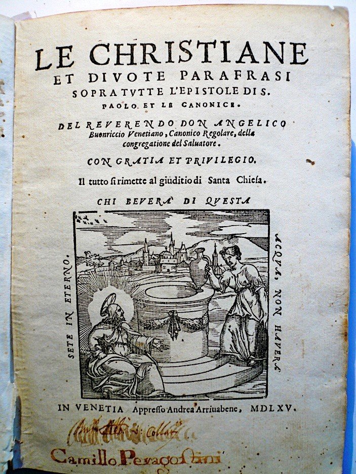 In-4° (20,2x15,2 cm). (4), 43, (1), 177, (5), 181-232, (2) carte. Grande marca tipografica dellArrivabene: Samaritana al pozzo offre da bere a Gesù. Città sullo sfondo. Al verso di c. 3 si legge: Con licentia delli Reverendi padri Inquisitori, del Tribunale della Santa Inquisitione di Venetia. (imprimatur di dubbia autenticità: enfatizzazione nella stampa a piena pagina con caratteri di grandi dimensioni e mancanza assoluta di riferimenti quali data e nominativo dellinquisitore) ma inserita negli Index di Parma del 1580 e successivamente di Roma del 1590 e del 1593 (De Bujanda, Index des livres interdits IX, 94+422+423; IX, 03+0272; X, pag. 106). Legatura coeva in mezza pelle con piatti marmorizzati, tagli rossi. Una firma sul forntespizio e qualche nota dell'epoca sui margini bianchi. Rara prima edizione. Lopera si compone di due parti: Parafrasi sopra tutte le Epistole di S. Paolo, dedicate al Rever.do P. Don Tranquillo Zupponi venetiano Priore digniss. di S. Salvatore; Parafrasi sopra tutte le Epistole Canonice, dedicate al Reverendo Padre Don Giovanni Grisostomo da Bologna. Il Buonriccio ribadisce costantemente il concetto di giustificazione per sola grazia iniziando con lesaminare lEpistola ai Romani, quella che affronta in modo più approfondito il problema e pertanto più utilizzata nelle dispute teologiche, modificandone lordine consueto di presentazione. Lavoro di grande rilevanza nellambito della riforma in Italia, ma che giunge tardivamente quando ormai il Concilio di Trento si era espresso in modo definitivo sul tema della giustificazione. Buonriccio Angelico venetiano, canonico regolare della Congregazione del Salvatore ( + 1605). Non risulta che al Buonriccio sia stata comminata alcuna condanna. EDIT 16/ICCU/CNCE/7873.