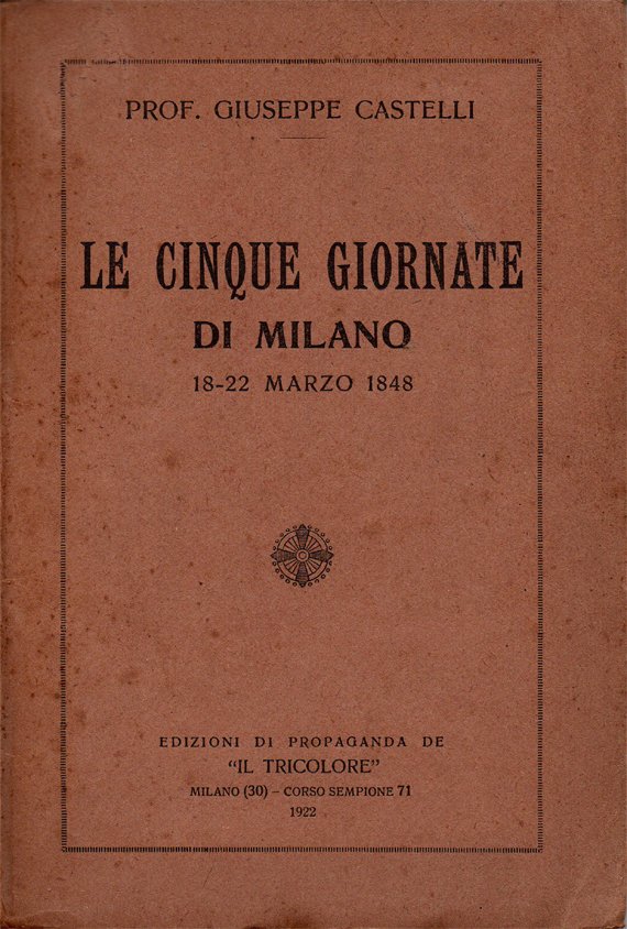 In-16° (18,9 x 12,8 cm), pp. 75, (5), copertina editoriale con normali segni del tempo. Con una tavola fuori testo, in fine, più volte ripiegata, raffigurante una cartina intitolata "Vie e piazze di Milano nel 1848". Numero di 4 cifre arabe nel bordo superiore della prima pagina bianca. Patina del tempo alle pagine, che presentano arrossature ai margini, dovute al tipo di carta, e qualche leggero segno d'umido. Esemplare intonso.