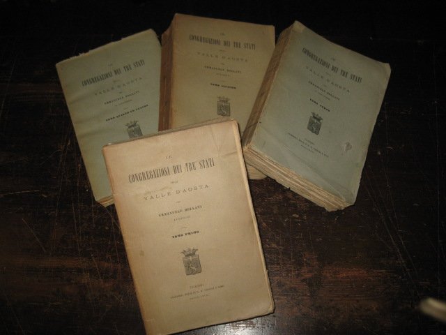 4 volumi in-8° (220x145mm), pp. XVII, 907; XXIV, 800; brossura editoriale a stampa con piccolo stemma di Aosta, ripetuto ai frontespizi. minimi restauri ai dorsi. In barbe, in parte intonso, impresso su carta distinta. Edizione originale a sé, impressa in soli cento esemplari, rarissima a trovarsi completa di tutto il pubblicato di questa poderosa opera dell'avvocato, archivista, storico e paleografo Emanuele Bollati di Saint-Pierre, raccolta di migliaia di statuti delle congregazioni e assemblee rappresentative della Valle d'Aosta. L'opera, edita sotto gli auspici del Municipio di Aosta, è estratta dagli 'Historiae Patriae Monumenta, edita iussu Regis Caroli Alberti' (tomi XIV-XV). Imponente fatica erudita, tuttora referenziale in materia. Per la sua rarità l'opera ha avuto un'anastatica nel 1988-'89. Esemplari completi di tutti e 4 i voll. sono presenti in SBN solo alla Nazionale di Firenze e all'Accademia delle Scienze di Torino. Il barone Bollati di Saint-Pierre, nato a Pont Canavese nel 1822, morto a Torino nel 1903, fu instancabile archivista ed erudito, tra i fondatori dell'Archivio di Stato di Roma e benemerito editore di testi e documenti. Le sue indagini spaziarono dalla storia locale allo studio del diritto medievale. Scrive lo Spreti a proposito di lui: 'Lo stemma fu conceduto insieme col predicato, nel 1881, ad Emanuele Bollati.il quale era stato creato barone per R. D. di motuproprio il 28 marzo 1882. Sovrintendente agli Archivi di Stato piemontesi, socio della R. Accademia delle Scienze e della R. Deputazione di storia patria, fu paleografo e diplomatista insigne, autore di poderose opere storiche ancora oggi apprezzate e consultate'. Manno, II, 10235. Manca al Lozzi e al Fontana. V. Spreti, II, 103-104.