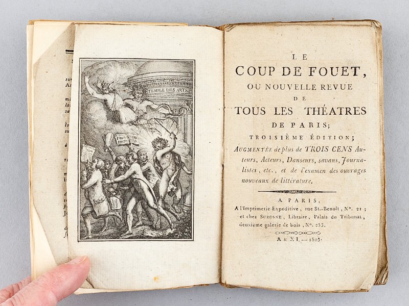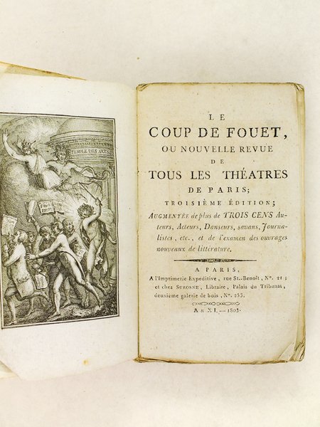 Troisième édition; augmentée de plus de trois cens Auteurs, Acteurs, Danseurs, savans, Journalistes, etc., et de l'examen des ouvrages nouveaux de littérature, 1 vol. in-18 br. (couv. postérieure), A l'Imprimerie Expéditive et chez Surosne, Paris, An XI, 1803, 221 pp. Rare exemplaire du temps, bien complet malgré une pagination capricieuse (la page 14 correspond à la page 10, sans manque). Exemplaire très modeste à établir dans une bonne reliure.