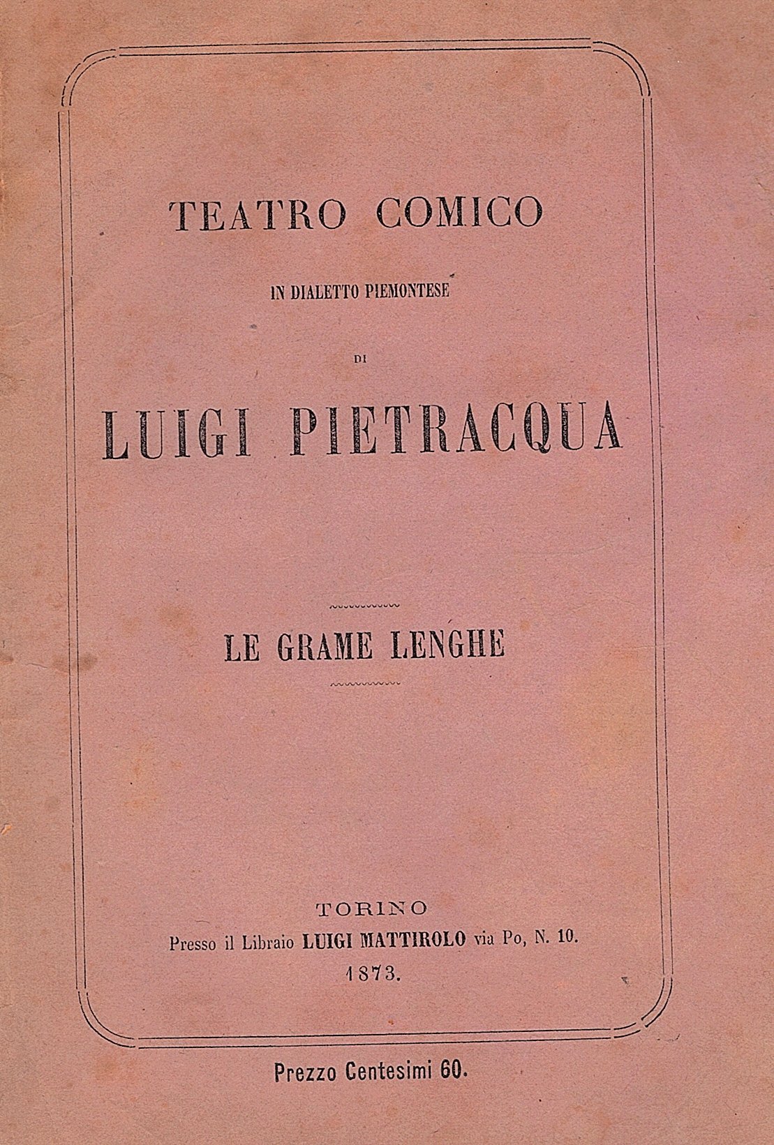 In-8° (23.5x15 cm) pp. 80, brossura non editoriale posteriore conservante il piatto anteriore originale con titoli entro duplice cornice. Collana Teatro comico in dialetto piemontese, Volume I parte seconda (pp 99-176). Buon esemplare. La commedia fu rappresentata per la prima volta la sera del 12 novembre 1862 in Torino al Teatro Rossini . Luigi Pietracqua (Voghera, 1832-Torino, 1901) fu fecondo autore di romanzi e commedie in vernacolo piemontese che ebbero fortuna vastissima.