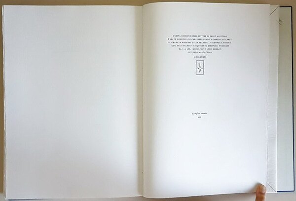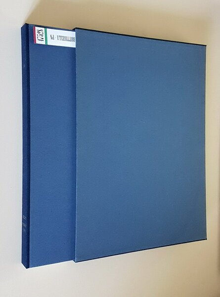 Vol. in 4 grande (25,5 x 35 cm.), custodia in cartoncino pesante blu, cartella sempre cartonata blu con titoli in oro al dorso, volume in brossura con sopracopertina col. avorio a busta alla francese con titoli in nero al dorso, velina trasparente, fogli con barbe, pp. XXIV, 143, (5). In ottime condizioni.
