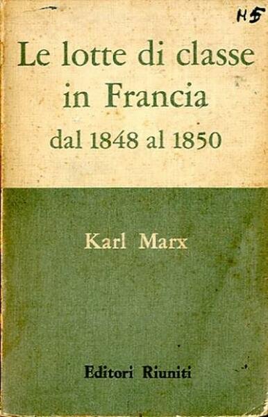 313 p. ; 18 x 12 cm. Piccola biblioteca marxista. Nuova serie. L'opera di Marx «Le lotte di classe in Francia dal 1848 al 1850» venne pubblicata sulla «Neue Rheinische Zeitung Politisch-ökonomische Revue» come serie di articoli aventi per titolo «Dal 1848 al 1849», «Il 13 giugno 1849», «Ripercussioni del 13 giugno sul continente» e «La situazione attuale: l'Inghilterra». Solo i primi tre vennero pubblicati nei fascicoli I-III. Nel 1895 Engels pubblicò una nuova edizione dell'opera di Marx intitolandola «Le lotte di classe in Francia dal 1848 al 1850» e dando titoli nuovi ai tre capitoli già apparsi. Come quarto capitolo aggiunse le parti dedicate alla Francia della Rassegna maggio-ottobre 1850 con il titolo «La soppressione del suffragio universale nel 1850». Scrivendo il 13 febbraio 1895 a Richard Fischer, Engels affermò che il quarto capitolo forniva "una reale conclusione al tutto senza la quale esso [l'opuscolo] rimarrebbe un frammento". L'Introduzione per l'edizione in opuscolo delle «Lotte di classe in Francia dal 1848 al 1850», che uscì a Berlino nel 1895, fu scritta da Engels pochi mesi prima della sua morte, fra il 14 febbraio e il 6 marzo 1895 e nella presente edizione è riportata alle pagine 3-31. Il 6 marzo 1895, tramite una lettera di Richard Fischer, la direzione del Partito socialdemocratico tedesco, adducendo motivi di opportunità tattica e accennando al pericolo sempre incombente di una legge contro i socialisti, chiese a Engels di attutire il tono, ritenuto troppo rivoluzionario, dell'Introduzione e di accogliere una serie di modifiche che si considerava necessario apportarvi. Engels, pur manifestando riserve e critiche nei confronti dell'atteggiamento irresoluto del partito e delle sue preoccupazioni legalitarie, accolse quasi tutte le richieste di modifica avanzate e consentì che fossero cancellati i passi relativi a una eventuale "lotta armata del proletariato" contro la borghesia. Titolo originale dell'opera: «Die Klassenkämpfe in Frankreich 1848 bis 1850». Traduzione di Palmiro Togliatti. Introduzione di Friedrich Engels. A cura di Giorgio Giorgetti. Brossura editoriale, coperta in cartoncino flessibile. Segni del tempo alla coperta, ai risvolti, al taglio e alle pagine interne (ingiallimento). Alcune annotazioni ms. e firma di appartenenza, per il resto libro integro, da studio. Codice libreria 6543.