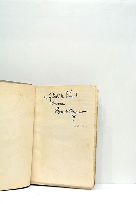 316 pages. (18,5x13cm.). Cartonnage. Dos lisse avec auteur et titre imprimé en rouge. Salissures. Coins un peu émoussés. Quelques taches et rousseurs. Papier un peu bruni. Couverture d'origine conservée. Edition originale limitée à 47 exemplaires. Envoi autographe de l'auteur à Gilbert de Voisins, écrivain, essayiste et traducteur français. Henri de Régnier, écrivain et poète français, proche du symbolisme se plaît à peindre des extravagances de son époque dans ce roman contemporain.