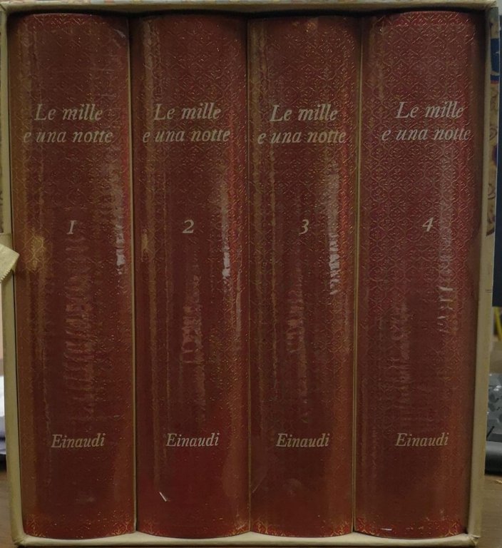 In-8 p., 4 volumi, legatura editoriale in tela (macchie alle pagine dei risguardi), illustrata con fregi oro al piatto anteriore e al dorso, cofanetto, pp. XXXVI, 730; XI, 758; VIII, 658; VIII, 787, cofanetto editoriale. Quinta edizione. Prima versione italiana integrale dall'arabo diretta da Francesco Gabrieli. Diretta da Francesco Gabrieli, collona I MILLENNI..