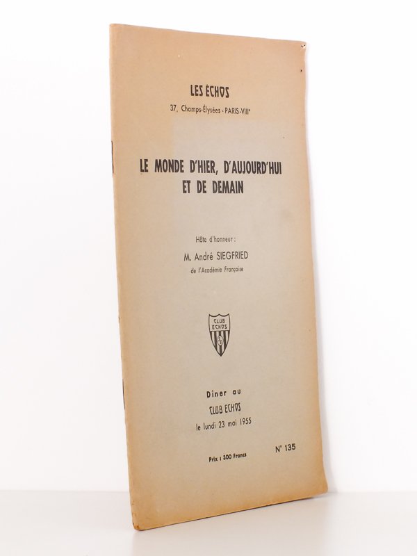 Le monde d'hier, d'aujourd'hui et de demain - dîner au Club Echos, le lundi 23 mai 1955 au restaurant de la tour Eiffel. Invité d'honneur : M. André Siegfried, de l'Académie Française. (Brochure de présentation)