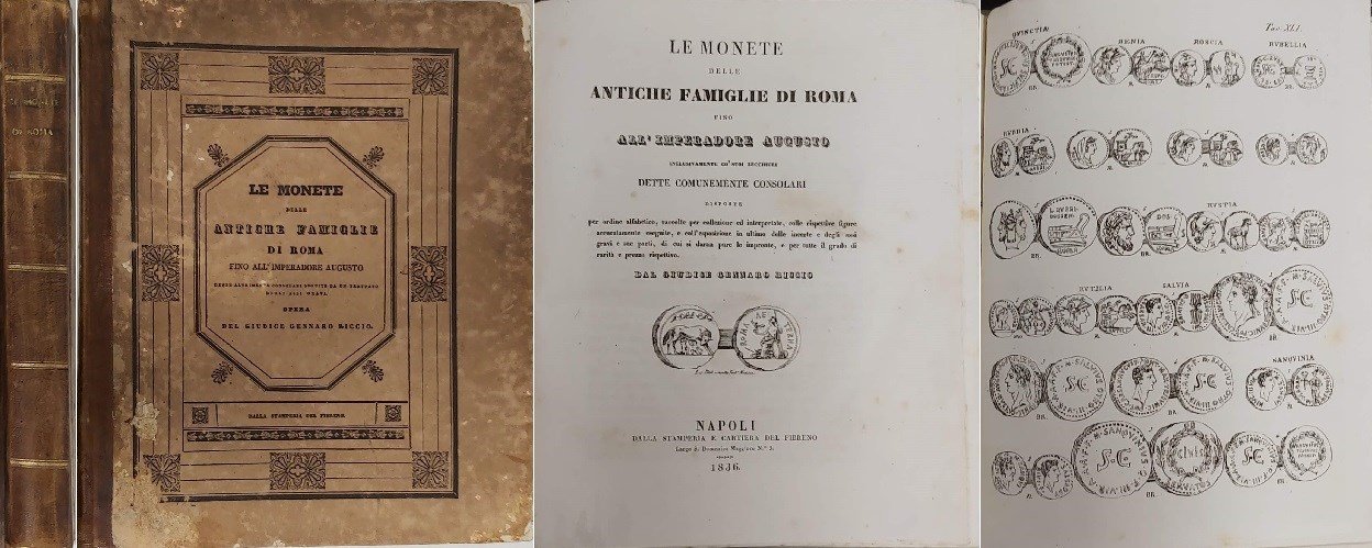 LE MONETE DELLE ANTICHE FAMIGLIE DI ROMA fino all’Imperadore Augusto inclusivamente co’ suoi zecchieri dette comunemente consolari. Disposte per ordine alfabetico, raccolte per collezione ed interpretate, colle rispettive figure accuratamente eseguite, e coll’esposizione in ultimo delle incerte e degli assi gravi e sue parti, di cui si daran pure le impronte, e per tutte il grado di rarità e prezzo rispettivo.