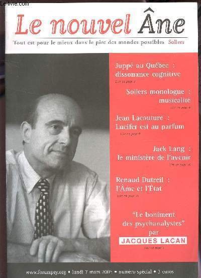LE NOUVEL ANE - NUMERO SPECIAL / 7 MARS 2005 / JUPPE AU QUEBEC : DISSONANCE COGNITIVE / SOLLERS MONOLOGUE : MUSICALITE / J. LACOUTURE : LUCIFER EST AU PARFUM / J. LANG : LE MINISTERE DE L'AVENIR / R. DUTREIL : L'AME ET L'ETAT / "LE BONIMENT DES PSCYCHA.