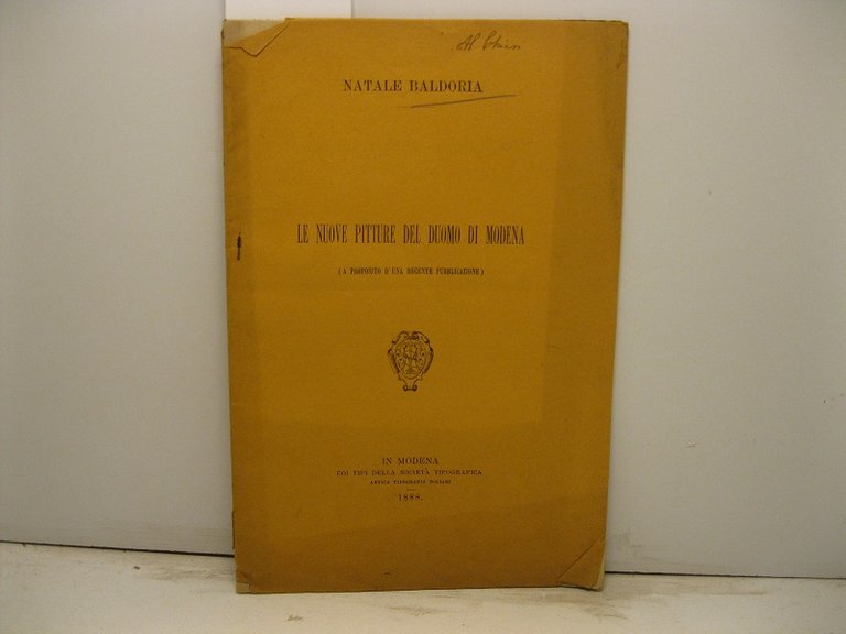 In 8, pp. 17 + (1b) + (1) + (1b). Br. ed. Saggio che critica una precedente pubblicazione di Chiaffredo Hugues che lodava le nuove pitture dell'abside del Duomo di Modena.