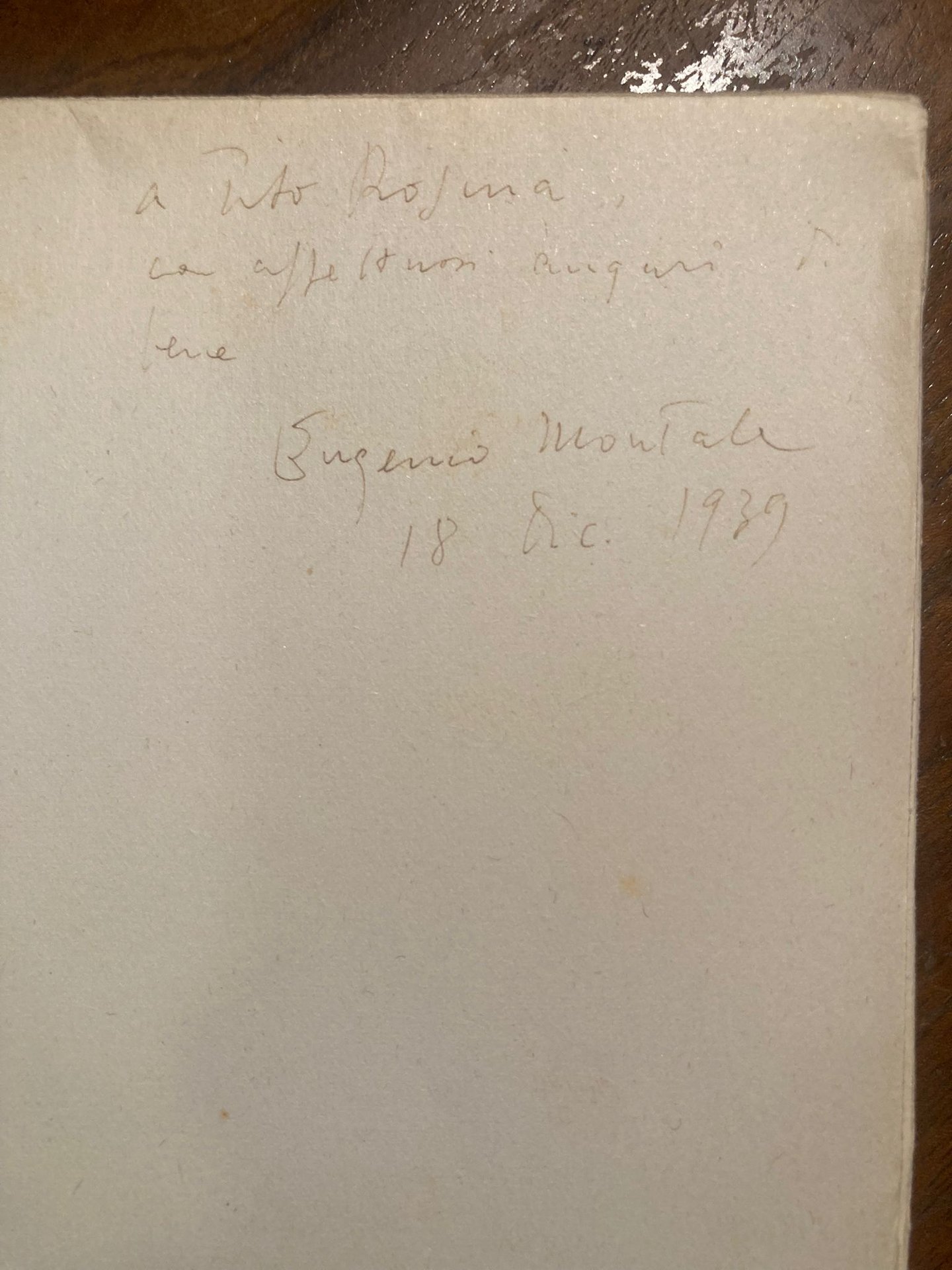 In-8° (22x16 cm), pp. 105, (3), brossura editoriale con titoli in nero al dorso e al piatto anteriore con incisione di Francesco Menzio raffigurante una farfalla. Ottimo e freschissimo esemplare con dedica manoscritta di Montale alla carta bianca anteriore. Edizione originale della seconda raccolta poetica di Montale, tra le più significative produzioni liriche europee del Novecento, in cui ancora più forte è, rispetto agli 'Ossi di seppia', il ricorso all'analogismo, mediato soprattutto attraverso T. S. Eliot. Nota dell'autore. La tiratura fu di 1000 copie. Cfr. Barile, Bibliografia montaliana, n. 33 (dettagliatissima descrizione); Gambetti - Vezzosi, p. 550; Spaducci, p. 185; Fusco, p. 119.