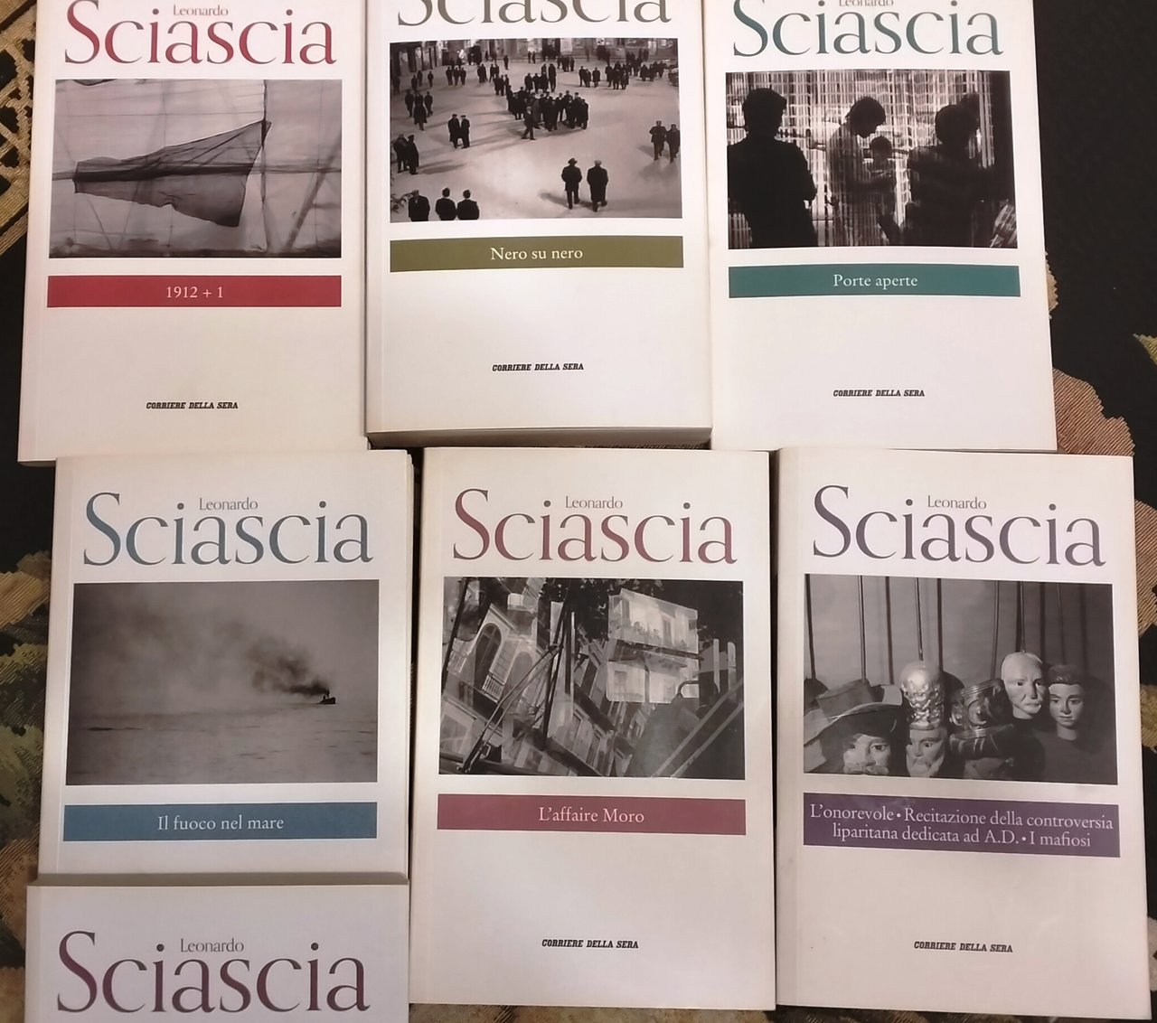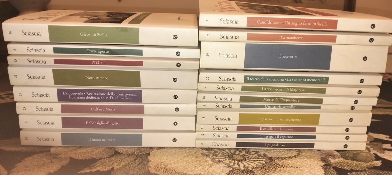 8° bross. edit. con alette. Collana "Le Opere di Leonardo Sciascia". Ottima conservazione. Elenco titoli disponibili: 1) La scomparsa di Majorana; 2) Nero su nero; 3) Morte dell'inquisitore; 4) Una storia semplice; 5) Le parrocchie di Regalpetra; 6) Il cavaliere e la morte; 7) La strega e il capitano; 8) I pugnalatori; 9)L'affaire Moro; 10) Il consiglio d'Egitto; 11) Il fuoco nel mare; 12) L'onorevole-Recitazioni della controversia lipariana dedicata ad A.D. - I mafiosi; 13) Porte aperte; 14) 1912+1; 15) Candido ovvero un sogno fatto in Sicilia; 16) Cronachette; 17) Cruciverba; 18) Il teatro della memoria - La sentenza memorabile; 19) Gli zii di Sicilia. IL LOTTO DI 19 VOLUMI