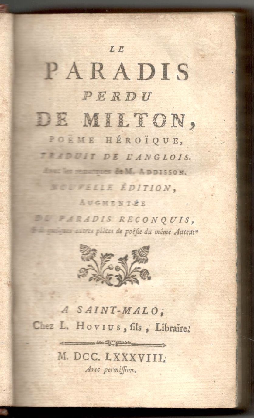 Le Paradis Perdu de Milton. Poëme Héroïque Traduit de l'Anglois. Avec les remarques de M. Addisson. Nouvelle édition, augmentée du Paradis Reconquis & de quelques autres pièces de poésie du même auteur