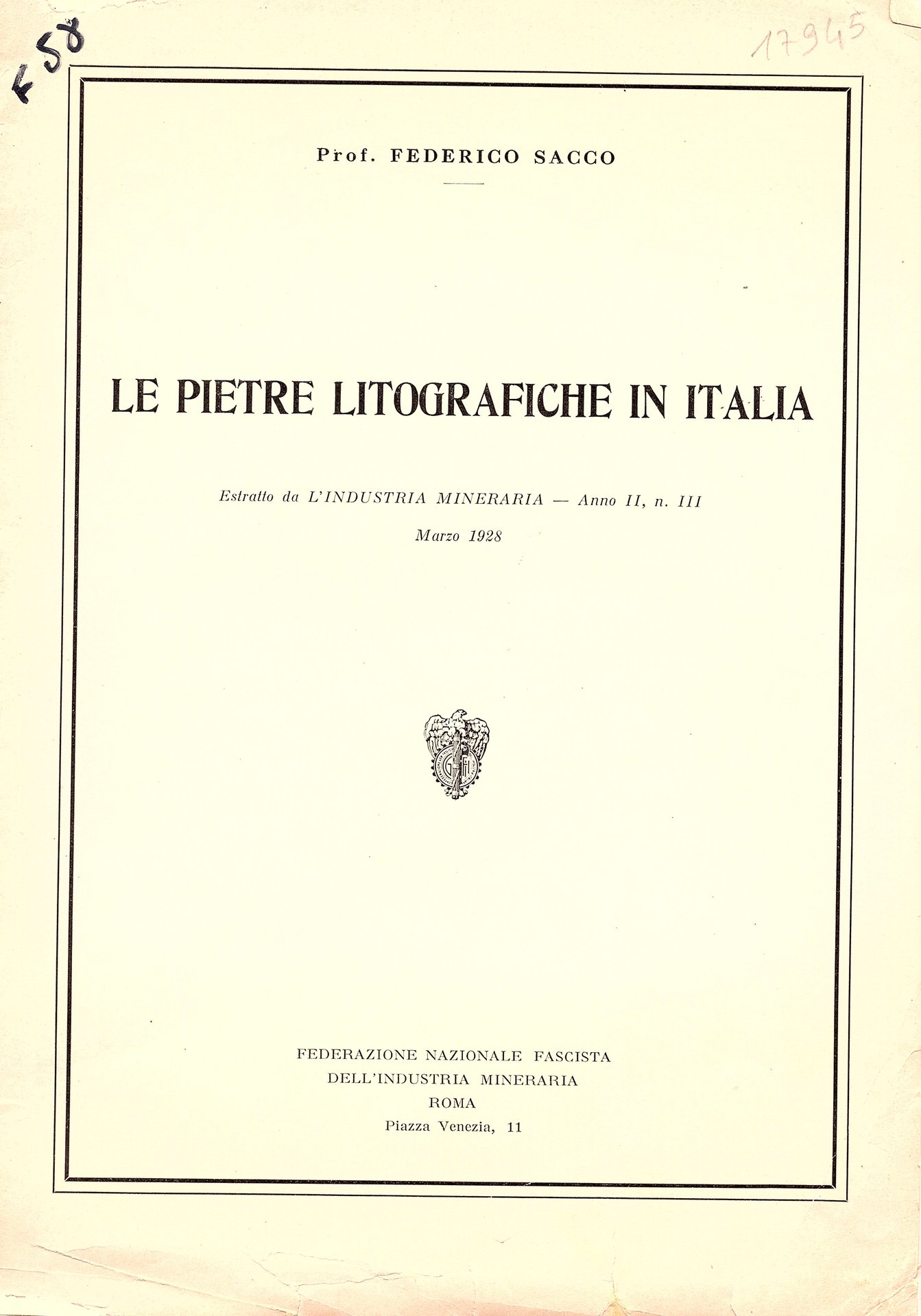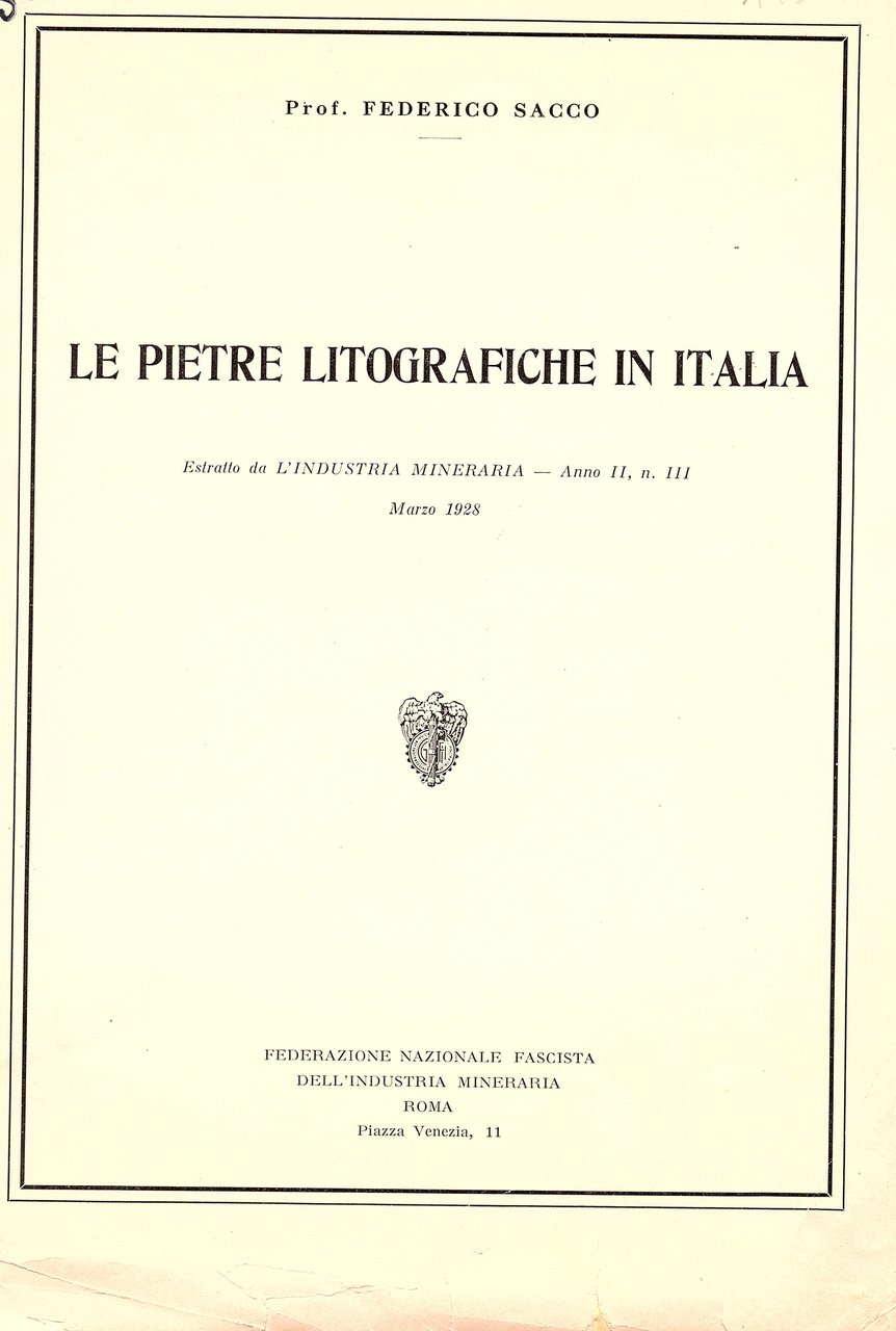 Le pietre litografiche in Italia. Estratto da L'Industria Mineraria - Anno II, n. III. Marzo 1928. Federazione Nazionale Fascista dell'Industria Mineraria Roma