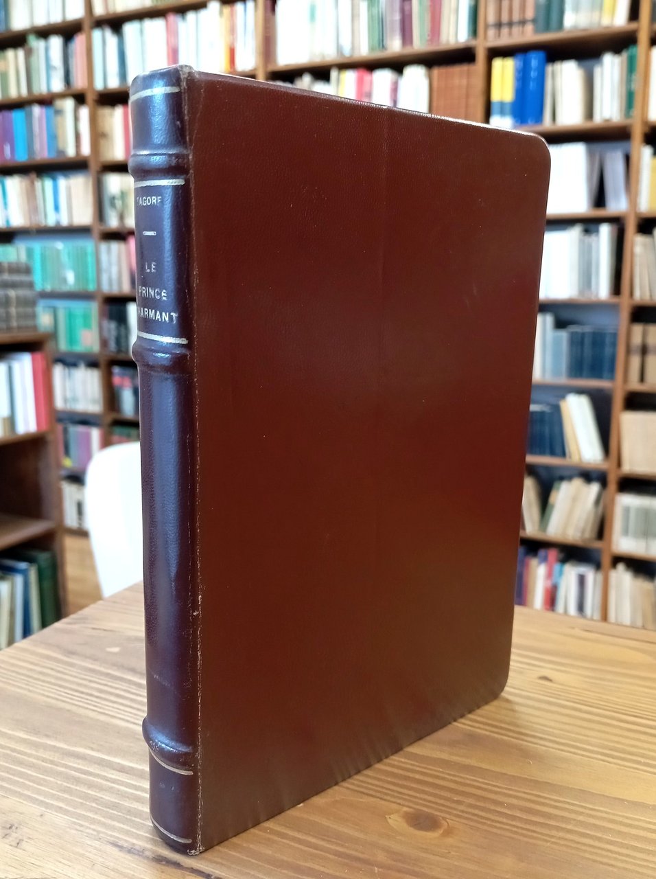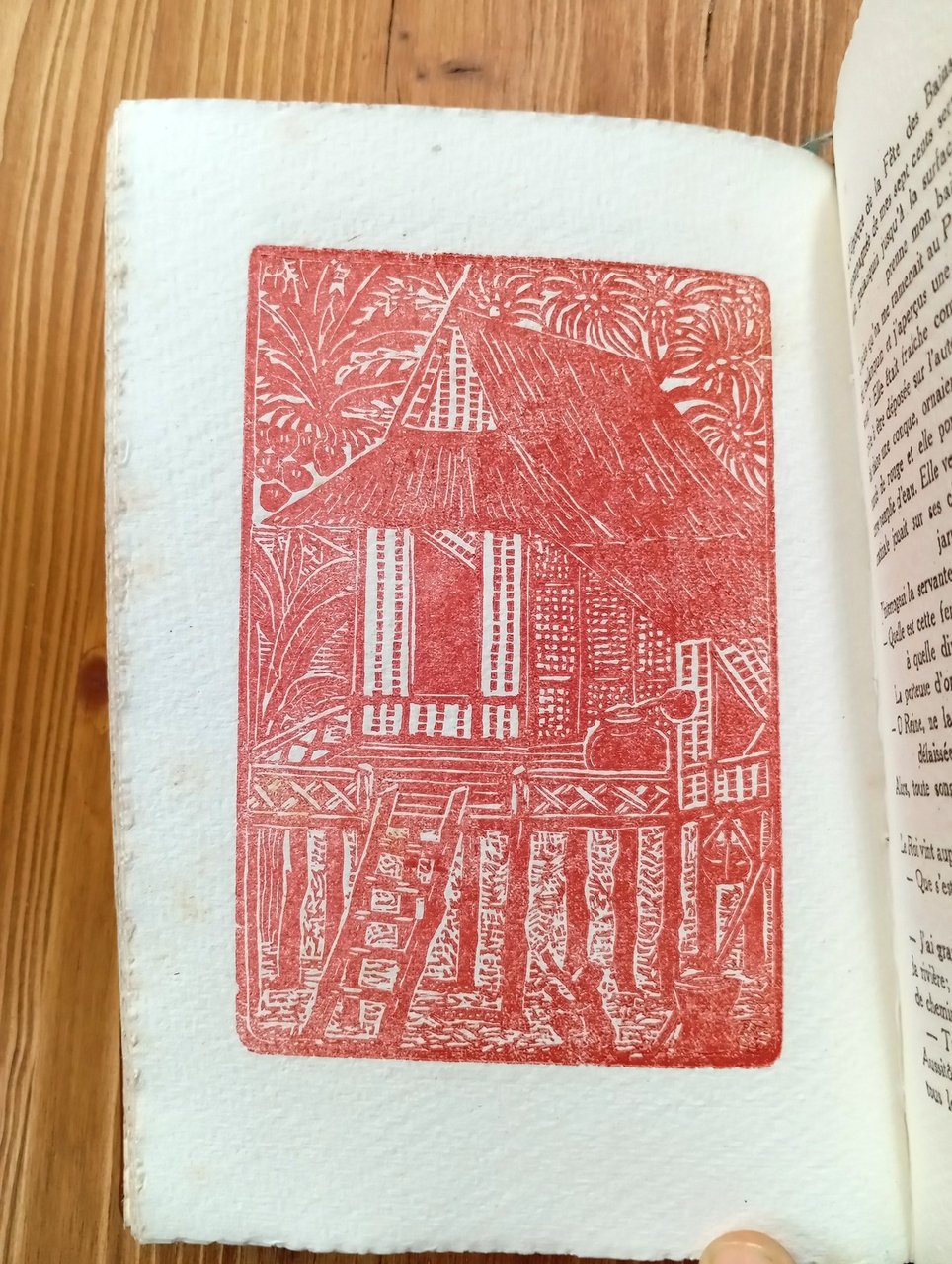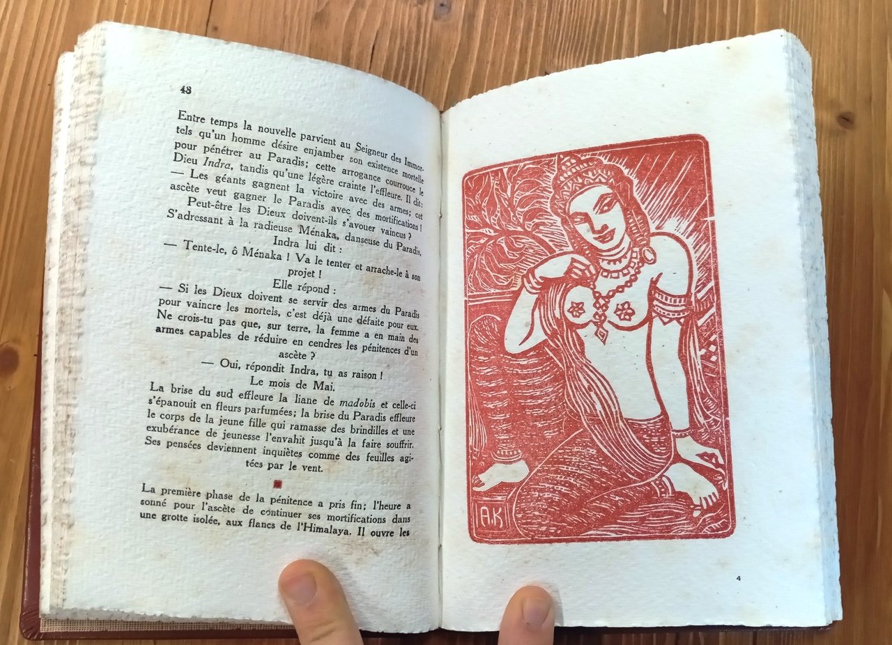 Edizione originale francese. "Feuilles de l'Inde", n. 10. Tiratura complessiva di 580 esemplari, 50 dei quali su carta forte Angoumois e numerati da 6 a 55, il nostro è il n. 48 - Volume rilegato in pelle amatoriale marrone, titolo in oro al dorso, 104 pagine con splendide incisioni, testatine e finalini in rosso-bordeaux di Andrée Karpelès. Conservati all'interno i piatti della brossura originale. Qualche fioritura alle carte, ma nel complesso esemplare molto ben conservato di un'edizione rara e pregevole.