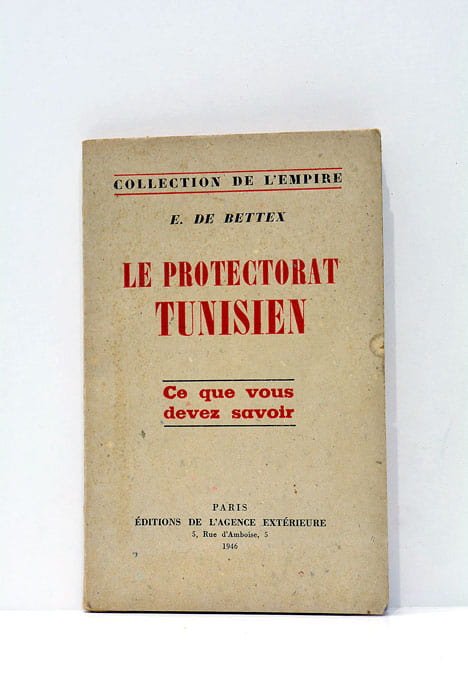 97 pages. 6 feuillets. 1 carte hors texte. Illustrations dans et hors texte. (19x12cm). Broché. Couverure brunie avec petites taches éparses. Petites déchirures marginales. Coins légèrement émoussés. Publié à Paris en 1946, cet ouvrage d'E. de Bettex aborde le protectorat tunisien, une période cruciale dans l'histoire franco-tunisienne. Dans le contexte de l'après-guerre, alors que la France se reconstruit et que les mouvements d'indépendance gagnent en puissance dans les colonies, l'auteur examine les dynamiques politiques, sociales et économiques du protectorat instauré en 1881. Cette analyse offre un aperçu des enjeux de l'époque, tout en éclairant les débats contemporains sur les héritages coloniaux et les relations entre la France et la Tunisie aujourd'hui. Papier bruni avec petites taches et rousseurs éprses. Exemplaire partiallement non-coupé. 1 carte hors texte. Illustrations dans et hors texte. Envoi de l'auteur sur le 1er feuillet.