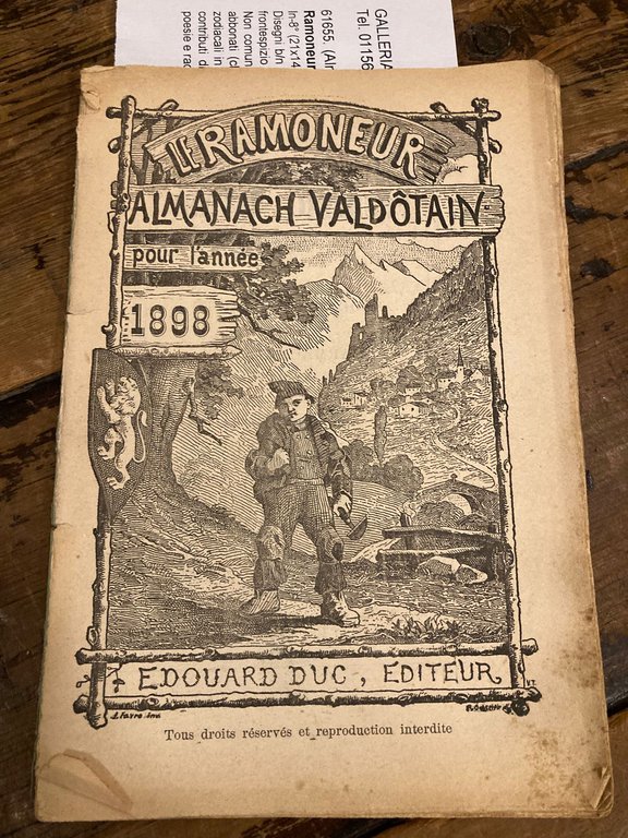 In-8° (21x14 cm), pp. 105 (7), brossura editoriale azzurra con frontespizio figurato b/n (J. Favre). Disegni b/n nel testo (sempre di Favre). Buon esemplare mancante del piatto anteriore di cui il frontespizio è gemello. Non comune terza uscita di questo almanacco Strenna del giornale Le Mont - Blanc ai suoi abbonati (che uscì dal 1895 al 1907 e dal 1912 al 1926). Calendario con fasi lunari e segni zodiacali in principio; legenda di fiere e mercati in Valle d' Aosta, Piemonte e Savoia. Seguono contributi di letteratura popolare (leggende e agiografie), notizie di esposizioni internazionali, poesie e racconti dedicati ai piccoli spazzacamini.