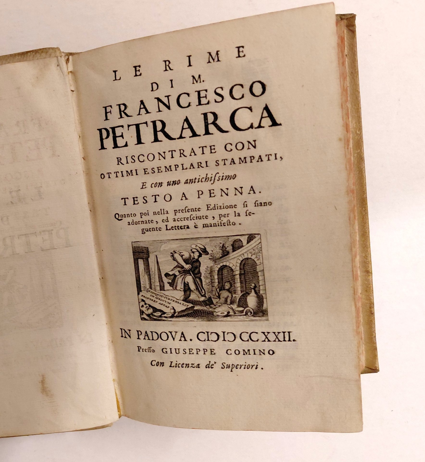 In 8o (cm. 17,5), pagg. (CIV)397, piena pergamena con tassello al dorso, vignetta dello stampatore al frontespizio (uomo che disotterra antichita' e motto Quidquid sub terra est in apricum proferet aetas), belle testatine, capolettera, finalini e stemma dei Volpi al colophon, tagli spruzzati in rosso. Vita del Petrarca di Lodovico Beccatelli.