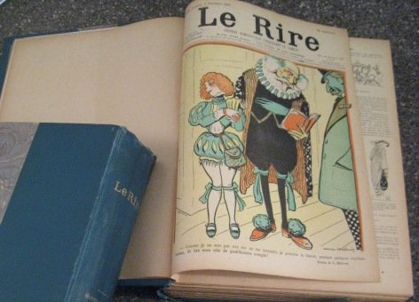 2 volumi in-4° (318x235mm) in legatura in m. tela turchese e angoli con illustrazioni caricaturali impresse a secco e titolo in oro. Piatti pavonati. Comprende la raccolta dei numeri di 'Le Rire' dal 313 (3 novembre 1900) al 416 (25 ottobre 1902), inclusi i rari numeri speciali del periodico; l'ottava annata del 1901 è presente nella sua totalità. Migliaia di illustrazioni a colori e in b.n. n.t. e f.t., dovute ad artisti come Forain, Toulouse Lautrec, Steinlen, Valloton, Gyp, Willette, Léandre, Caran d'Ache, Fau, Jeanniot, Métivet, Heidbrinck, Godefroy, Couturier, Hermann-Paul, Jean Veber, Cappiello, etc., e contributi testuali di scrittori come Jules Renard, Willy, Allais, Tristan Bernard. Per ogni numero sono conservate le splendide brossure originali, illustrate a colori da alcuni dei maggiori artisti francesi del tempo. Bellissimo stato conservativo. Probabilmente la più popolare e fortunata rivista umoristica francese a cavallo tra la fine dell'Ottocento e i primi decenni del XX secolo (ma il periodico seguitò le pubblicazioni sino agli anni Cinquanta del Novecento), 'Le Rire' adunò il fior fiore delle arti figurative e delle lettere della Francia del tempo, sferzando impietosamente soprattutto la vita sociale e di costume nelle sue più varie manifestazioni e prendendo parte attivamente alle polemiche politiche, sostenendo, ad esempio, la causa di Dreyfus nel clamoroso 'affaire' giudiziario che lo vide protagonista e che ispirò il 'J'accuse' di Zola.