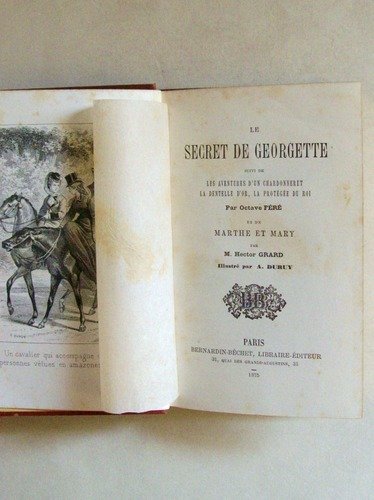 Le secret de Georgette, suivi de Les aventures d'un chardonneret, La dentelle d'or, La protégée du roi, par Octave Féré - Marthe et Mary par M. Hector Grard, illustré par A. Duruy, 1 vol. in-12 cartonnage rose éditeur, plats ornés, toutes tranches dorées, Bernardin-Béchet, Paris, 1875, 239 pp. Etat très satisfaisant. Peu courant.