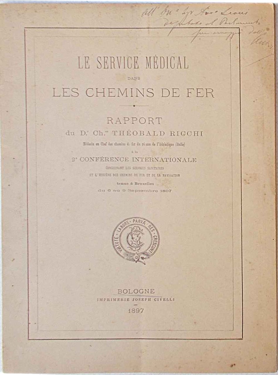 In 8° (cm. 24 x 16,5); pagg. 42; brossura origin. VG. ** Invio "omaggio dell'Autore". Rappoorto alla 2^ Conferenza Int.le sui Servizi Sanitari delle Ferrovie e della Navigazione di Bruxelles del settembre 1897. L'Autore era il medico capo delle ferrovie dell'Adriatico.
