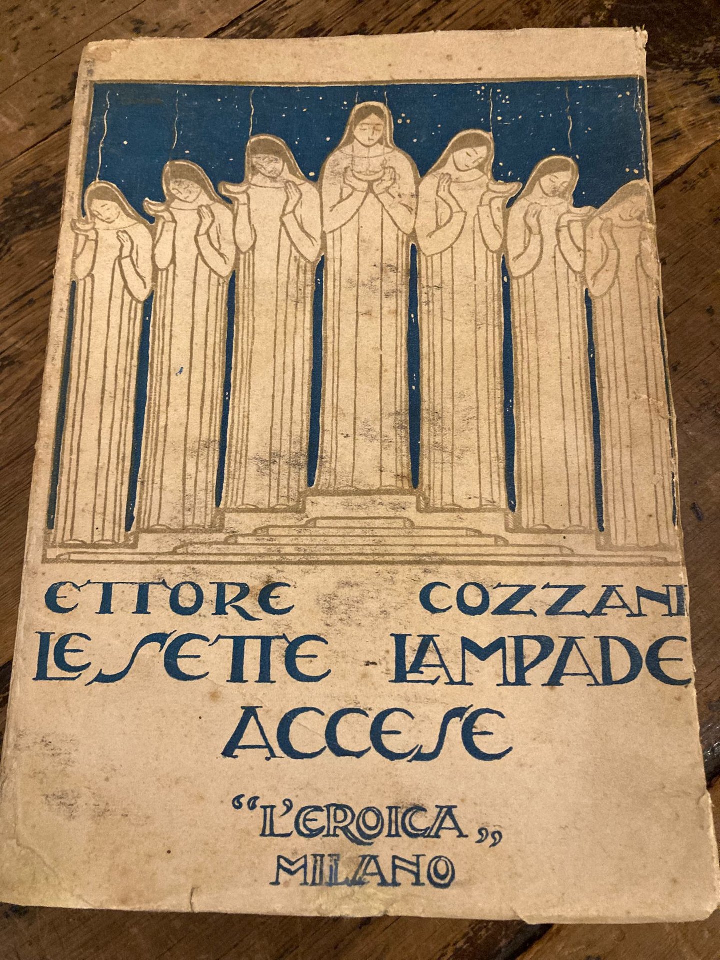 In-4° (26x18 cm), pp. 261 (13), brossura editoriale con titoli blu al piatto anteriore con illustrazione silografica in bicromia di Francesco Gamba ripetuta al frontespizio. Testo stampato entro filetto tipografico continuo blu o rosso in alternanza alle tavole silografiche f/t in viratura rossa o blu di Gamba (dedicate a Gilda Masini). Lievi segni del tempo e d' uso ai piatti. Interno fresco. Una dedica del tempo alla carta bianca anteriore. Più che buon esemplare in barbe. Edizione originale di qusta raccolta di scritti per 'giovanetti'.