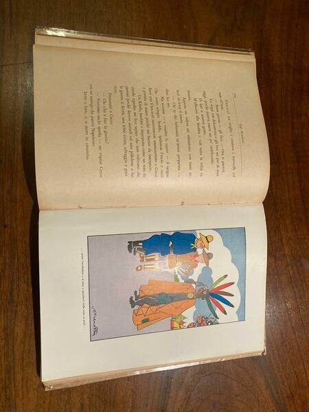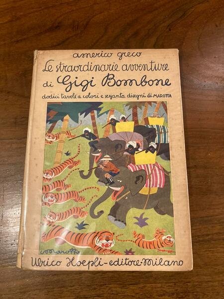 In-8°, pp. (8), 193, cartonatura editoriale con illustrazione a colori di Marotta . Sguardie figurate, 60 disegni in b.n. n.t. e 12 tavv. a colori f.t. dello stesso Marotta. Ex-libris. Ottimo stato. Allegate entro busta editoriale applicata 4 cartoline a colori riproducenti illustrazioni di Marotta per il presente volume. Prima edizione di questo romanzo del fortunato ciclo di Capitan Bombone, una sorta di imitazione del Barone di Münchhausen contaminata con alcuni spunti salgariani. Americo Greco (1888-1948) fu fecondo scrittore per la gioventù. Egli esordì giovanissimo con alcuni racconti sulla rivista Per Terra e per Mare e dal 1905 collaborò al Giornale dei Viaggi di Luigi Motta, per conto del quale egli inviò una lettera ad Emilio Salgari, che rispose fornendogli dei cenni autobiografici volti ad accreditare la leggenda del suo brevetto marinaro. I suoi romanzi d'avventura risentono, appunto, del grande modello salgariano.