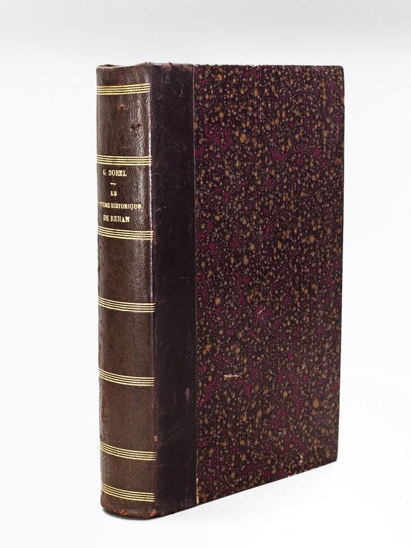 1 vol. in-8 reliure de l'époque demi-basane marron, G. Jacques, Paris, s.d. [ 1905-1906 ], 475 pp. Rappel du titre complet : Le Système historique de Renan (5 Parties - Complet) [ Edition originale - Livre dédicacé par l'auteur à Vilfredo Pareto et signé par Pareto ] I : Introduction ; II : Renan, historien du Judaïsme ; III : Renan, historien du Christianisme ; IV : Les Premiers Temps apostoliques Exceptionnel exemplaire de l'édition originale, dédicacée par Georges Sorel "A mon ami V. Pareto, Cordial Souvenir". L'exemplaire porte également la signature autographe de Vilfredo Pareto, sur la couverture conservée du premier fascicule. L'amitié du philosophe et sociologue français Georges Sorel (1847-1922) et de l'économiste et sociologue italien Vilfredo Pareto (1848-1923) remontait à l'année 1896 ; elle se maintiendra jusqu'au décès de Georges Sorel, malgré leurs fortes divergences philosophiques. Dans son célèbre "Traité de Sociologie", Vilfredo Pareto citera cet ouvrage en indiquant : "Tout ce livre est à lire et à étudier attentivement".