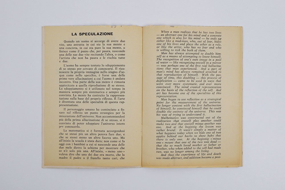 LIBROEdizione originale.Ottimo esemplare, lieve macchia al piatto posteriore, pagine interne fresche e pulite.È il primo libro di Michelangelo Pistoletto — pubblicato in proprio e, secondo quanto dichiarato dall’artista in “Continenti di Tempo”, stampato in 60 esemplari — nonché, per contenuti e grafica, una delle pubblicazioni di riferimento dell’Arte povera. Il libro di solo testo, stampato in italiano e in inglese, raccoglie riflessioni dell’artista sul suo lavoro esposte in due capitoli, intitolati “La speculazione” e “L’essere”, in cui Pistoletto esplora il concetto di sdoppiamento. Ne nasce una sorta di breve compendio teorico alla poetica dell’artista maturata «in conseguenza dei quadri specchianti» (p.[8]), a cui fa esplicito riferimento nel corso dell’opera.Michelangelo Pistoletto - Continenti di Tempo, a cura di T. Raspail, I. Bertolotti, M. Maffesoli, Musee D'Art Contemporain de Lyon, 2001; G. Maffei, Arte Povera 1966-1980 - Libri e documenti - Books and documents, Mantova, Corraini, 2007, p. 162.