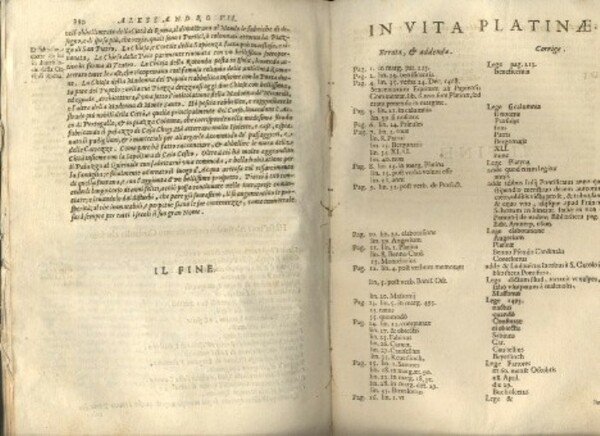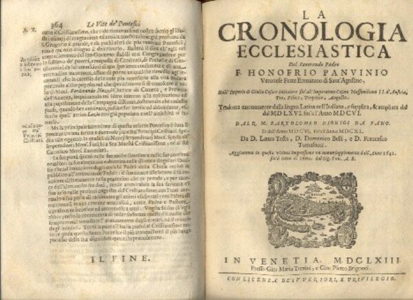 Le Vite dei Sommi Pontefici, dal Salvator Nostro sino a Paolo II. Accresciute con quelle de Papi Moderni da Sisto Quarto fino ad Alessandro VII , regnante. Con le annotazioni del Panuinio e con la Cronologia Ecclesiastica dell'istesso, ampliata da Bartolomeo Dionigi, da Lauro Testa, da Francesco Tomasuccio, e dal sudetto Bagatta, fino all'anno 1663. Aggiuntovi anco in questa ultima impressione la vita del Platina scritta diffusamente dal Sign. Nicolangelo Caferri. Con i nomi, cognomi e patrie di tutti li cardinali, e tre copiose tavole; una de' Papi, la seconda de' Cardinali, e la terza delle Cose Notabili.