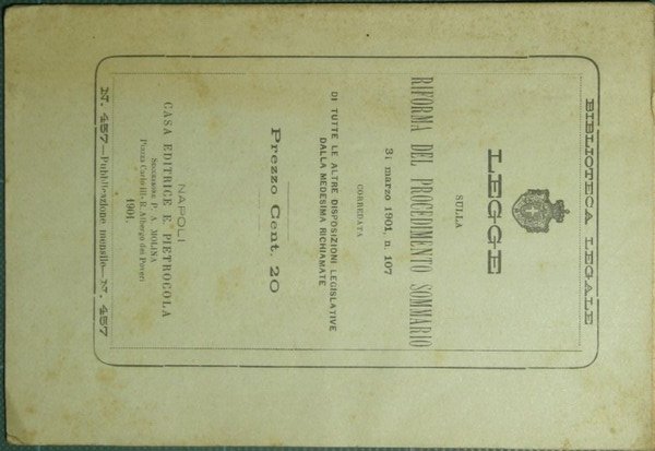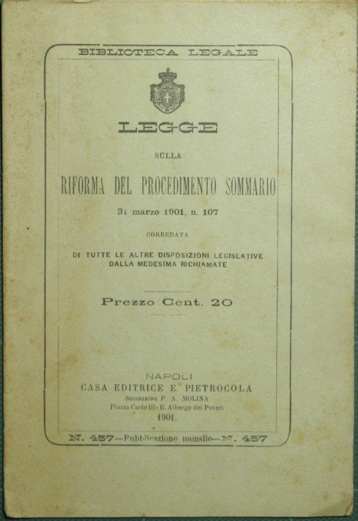 31 marzo 1901, n. 107 - Corredata di tutte le altre disposizioni legislative dalla medesima richiamate - Collana Biblioteca legale. N. 457 - in 16° - pp.7 - Brossura editoriale