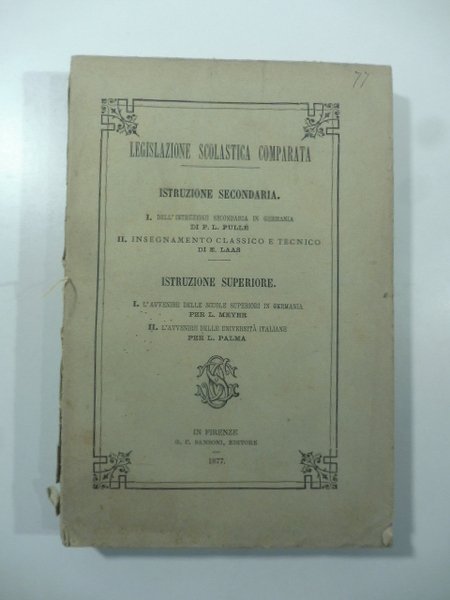 In 16 (cm 13 x 19,5), pp. (10) + 347 + (3b). Brossura editoriale. Miscellanea contenente i seguenti saggi: Dell'istruzione secondaria in Germania; Insegnamento classico e tecnico; L'avvenire delle scuole superiori in Germania; L'avvenire delle Universita' italiane.