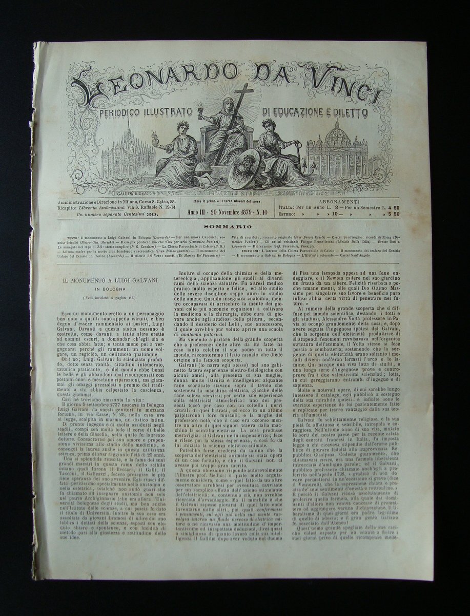 Periodico illustrato, Leonardo Da Vinci" Anno III- 20 Novembre 1879 N. 10 La Chiesa Parrocchiale di Calcio Tip.dell'Osservatorio Cattolico, 1879 cm 37x27, da pag. 110 a pag. 120 (numerazione progressiva) con qualche ill. in bella grafica in b/n nel testo. Numero completo. Condizioni di conservazione Esemplare in buone condizioni con leggere tracce d'uso e del tempo; dorso con alcune minuscole mancanze per distacco da volume rilegato; leggere tracce di pieghe conservative, qualche minima macchietta e brunitura. Lungo articolo descrittivo della Chiesa Parrocchiale di Calcio, incisione a piena pagina dell'interno Numero completo. SC03.D14166 blu "