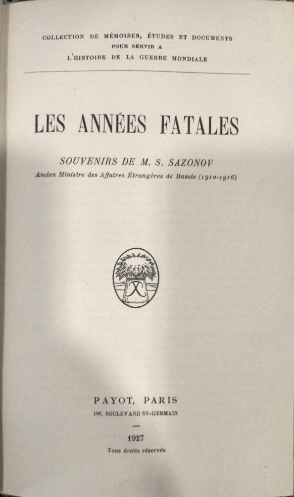 Les Années Fatales Souvenirs De M.S. Sazonov