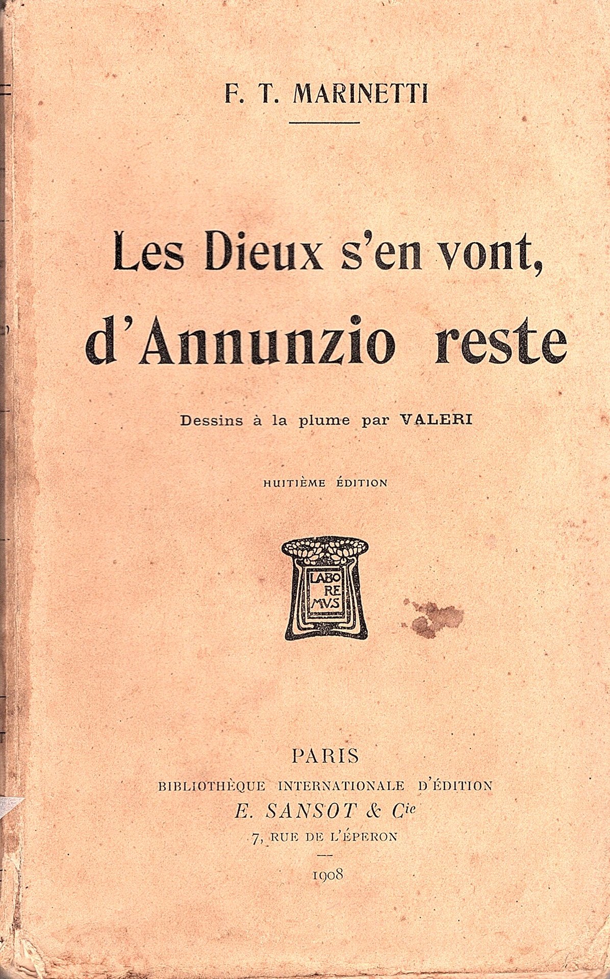 In-16° (187x116mm), pp. 201, (2), brossura editoriale (con minimi restauri al dorso). 11 illustrazioni al tratto f.t. di Ugo Valeri (Piove di Sacco, 1874-Venezia, 1911). Bell'esemplare. Edizione originale in volume con dicitura fittizia di 'huitième édition' di questo celebre volume di elzeviri marinettiani sul Vate, elegantemente illustrato dal Valeri, pittore veneto che ebbe da Vittorio Pica l'epiteto di 'Toulouse Lautrec italiano'. I testi, ricchi di aneddoti e di passaggi intrisi di forte ironia, in cui emerge un sentimento misto di ammirazione e insofferenza nei confronti di D'Annunzio, erano apparsi in precedenza su riviste parigine e milanesi tra il 1903 e il 1907. Salaris, p. 45. Cammarota, 16. Gambetti / Vezzosi, p. 514. Falqui, p. 44. Spaducci, p. 175.