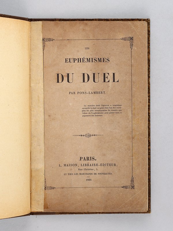 1 vol. in-8 reliure fin XIXe bradel demi-percaline marron, couv. cons., L. Maison, Paris, 1846, 55 pp. Bon état. Edition originale de cette rare brochure dans laquelle l'auteur tente de "dépouiller ce féroce préjugé" du duel "des noms sous lesquels il s'efforce de cacher son atroce honte". "Il fait voir que la manière dont l'opinion a longtemps accueilli le duel est peut-être l'un des exemples les plus remarquables du trouble que l'abus de l'euphémisme peut porter dans le jugement des hommes".