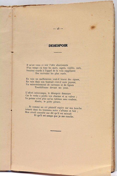 34 pages. 1 feuillet. (23x14,5 Cm). Broché. Couverture imprimée. Petites déchirures sur les plats. Salissures. Rousseurs. Papier bruni. Traces de plis. Cahiers partiellement dereliés. Première édition de ce recueil de poèmes de Maurice Clavel, écrivain, journaliste et philosophe français qui s’est engagé dans la Résistance sous le pseudonyme de Sinclair. Envoi de l'auteur à Monsieur Seheurer sur la page du faux titre. Décrit par certains comme "indomptable" il a été étiqueté d’extrême gauche depuis qu’il a interprété mai 68 comme un immense jaillissement de la parole.