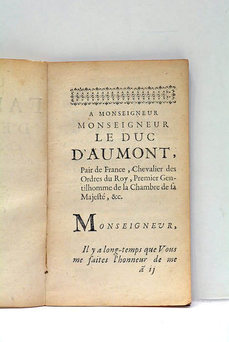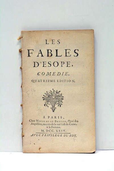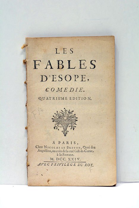 9 feuillets. 99 pages. (16,5x9,5 Cm). Broché. Petites restes de reliure au dos. Tranches rouges. Rousseurs. Papier bruni. Comedie en 5 actes. La 4éme édition. "Ce qui m'a paru le plus dangereux dans cette entre`prise, ç'a été d'oser mettre des Fables en vers aprés l'illustre Monsieur de la Fontaine,."