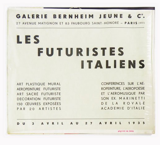 LIBROEdizioni originali.Ottimo esemplari (minime e fisiologici segni del tempo; lieve arricciamento delle pagine dovuto anche al naturale restingersi della sovracoperta in acetato; in ogni caso, una copia non circolata).Rarissima emissione cumulativa dei due cataloghi, procurata in occasione della stessa esposizione dell’aprile 1935 alla galleria parigina Bernheim Jeune — ultima grande collettiva futurista in Francia prima della morte di Fillia e del conseguente declino di tutto il movimento artistico futurista, che prelude alla tragedia della seconda guerra mondiale: «Una nuova ampia esposizione futurista a Parigi contribuisce all’ulteriore fortuna internazionale del movimento, attorno alle personali di Prampolini, attivissimo leader, Depero, Rosso, Fillia e Tullio d’Albisola, proponendo tutta la gamma dell’operatività futurista: dall’aeropittura cosmica alla plastica murale, dall’arte sacra alle arti decorative e alle aeroceramiche» («Nuovi archivi del futurismo»). In realtà, a prescindere dalla scarna scheda dei «Nuovi archivi» — che suona assolutamente decontestualizzata; e stante il ruolo di punto di riferimento artistico assoluto che incarna Enrico Prampolini, superstar di livello europeo — il leader operativo del movimento nella fase rinascente che va dal 1929 al 1935 è proprio Fillia, come dimostra ulteriormente questa emissione cumulativa dei due cataloghi, la scarna plaquette per la Bernheim Jeune e il corposo fascicolo per la «Prima mostra nazionale di plastica murale per l’edilizia» («uno dei maggiori eventi propositivi del Futurismo negli anni trenta», secondo i «Nuovi archivi»): entrambi caratterizzati dalla modernissima grafica «Stile futurista», perfettamente allineata al gusto razionale e costruttivista che domina l’avanguardia internazionale dell’epoca, rappresentano il trionfo del progetto filliano, destinato a infrangersi con la prematura morte dell’artista torinese nel febbraio del 1936.Nuovi archivi del futurismo, I, 1934/15 e 1935/5b.