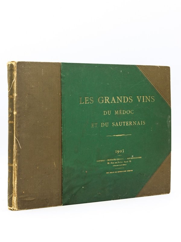 1 vol. in-4 format à l'italienne reliure de l'éditeur demi-percaline à coins verte, Gustave Chariol, Bordeaux, 1903, avec 97 vues hors texte sous serpente Rare exemplaire de l'édition originale. L'ouvrage propose 97 vues des grands châteaux du Bordelais : pour les Grands Vins du Médoc, les 4 premiers crus (Margaux, Lafite, Latour, Haut-Brion), les 16 deuxièmes crus, les 11 troisièmes crus, les 11 quatrièmes crus, les 16 cinquièmes crus ; pour les Crus exceptionnels de Graves, les 9 châteaux ; pour les Grands Vins du Sauternais, les 11 premiers crus (dont Château Yquem) et les 18 deuxièmes crus. Chaque planche indique le nom des propriétaires, et propose un petit commentaire. Etat très satisfaisant (rel. lég. frottée avec qq. usures en mors, une main postérieure a annoté au crayon à papier, sur la plupart des planches, le nom des propriétaires postérieurs - vers 1950)