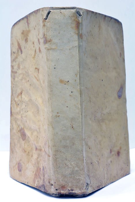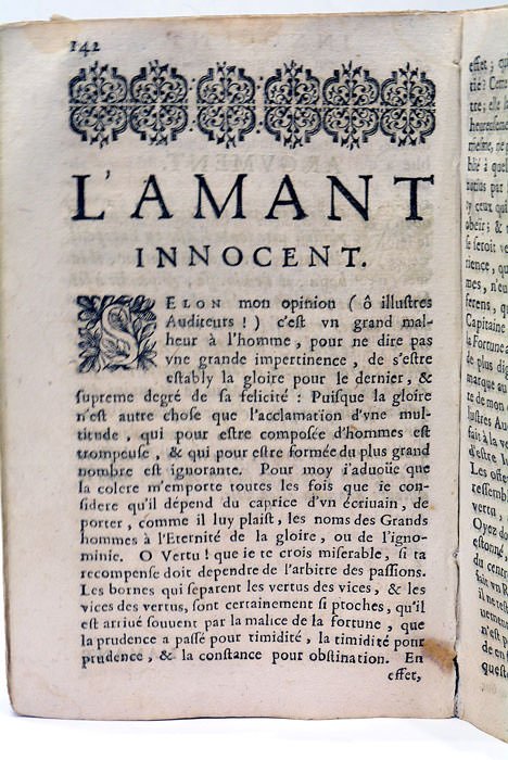 12 feuillets. 230 pages. (i.e. 300). (16x10,5 Cm). Plein vélin de l'époque. Plat inférieur un peu froissé. Quelques taches aux plats. Petites mouillures et taches. Rousseurs éparses. Plis et traces de plis. Cet ouvrage de Manzini eut un succès considérable en France et cette traduction de Georges de Scudéry fut rééditée à plusieurs reprises. L'auteur nomme lui-même ses Harangues "des fureurs de la jeunesse", exprimant par là qu'elles s'affranchissent des règles. L'ouvrage contient 22 harangues dont de nombreuses sur des sujets de la mythologie grecque. Les harangues sont des discours, des morceaux d'éloquence adressés à un auditoire ; à la fin de chaque harangue, le résultat sur l'assemblée est donné ; Chaque harangue étant précédé d'un Argument, d'un prologue permettant de situer l'enjeu du discours. Cette édition présente une curiosité typographique: les pages composant le cahier M furent toutes imprimés par erreur d'un seul côté de la feuille, provoquant après pliage l'apparition de double-pages blanches, sans perte de texte. Notes manuscrites sur le contre-plat. Culs de lampe et ornements.