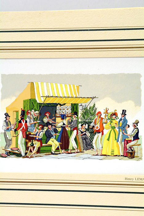 Suite de 4 minatures gravées sur bois, montées sous passe-partout encadré de filets dorés et teintés. (21x25,5 Cm). En feuillets sous portefeuille de toile verte, premier plat titré. Taches très légères sur le premier plat. Très bon état. Cette jolie suite inclue: "Le marchand de beignets à Nijni-Novgorod", "Le marchand de rafraîchissements à Naples", "Le marchand de macaronis à Naples", "Les petits marchands du lac Léman". Certificat des Heures claires signé de Jean Estrade. Henry Lemarié est un des miniaturiste français le plus célèbre de notre époque grâce à la précision de son dessin et au raffinement de ses couleurs.