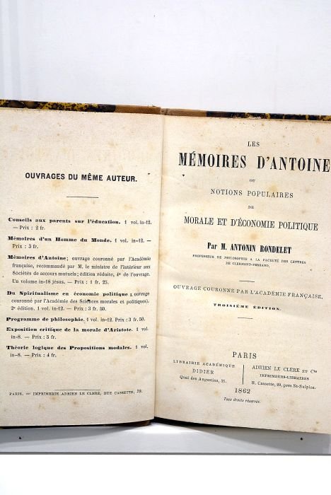 Les mémoires d'Antoine ou notions populaires de morale et d'économie politique. Ouvrage couronné par l'Académie Française. Troisième édition.