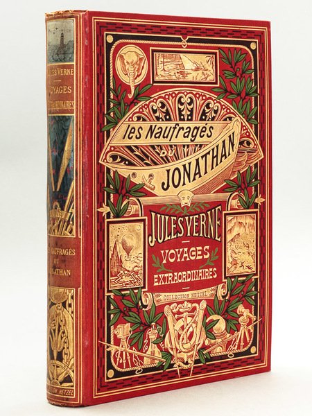 Illustrations de Georges Roux, dont 12 en chromotypographie, 1 vol. in-4 cartonnage éditeur pleine percaline rouge à un éléphant, dos au phare, titre dans l'éventail, toutes tranches dorées, collection Hetzel, Paris, s.d. (copyright 1909), 476 pp. Etat très satisfaisant (dos et coiffes frottés, des rouss., bon état par ailleurs). Jauzac, p. 310