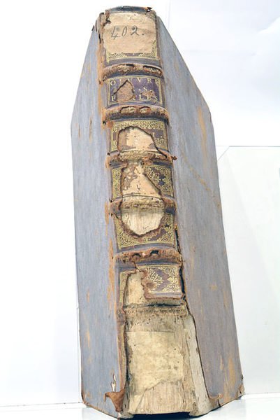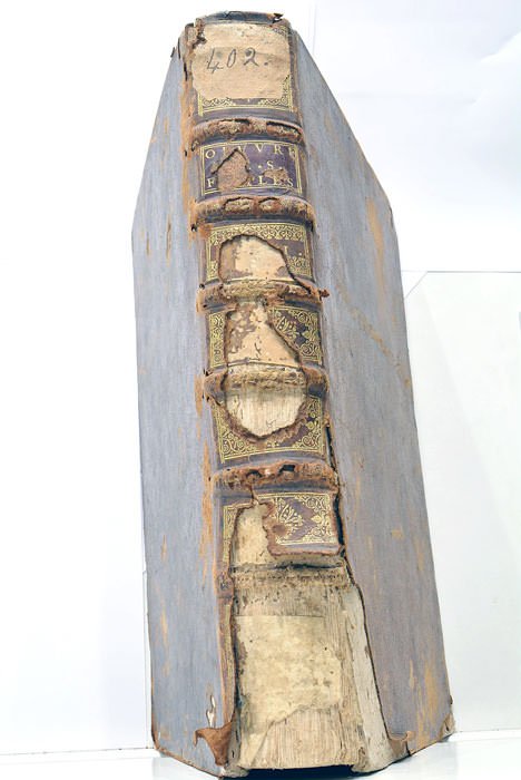 1) 1 feuillet. Page 1754 - 2308. 74 feuillets ( Table des matieres). 2) 2 feuillets. 363 pages. 2 feuillets. (37x25 Cm). Plein veau de l'époque très usé. Dos à nerfs doré. Pièce de titre en maroqien rouge. Importantes manques de cuir au dos et sur le premier plat. Coins émoussés. Rousseurs et taches. Déchirure sans manque de texte page 2216 - 2229. page 1809/1810-1815/1816 dereliées. Belle page de titre imprimée en rouge et noir. Nombreux très beaux culs de lampe. Texte en deux colonnes. Note manuscrite sur le contre-plat daté 1769. Imposante exemplaire meritant une restauration.
