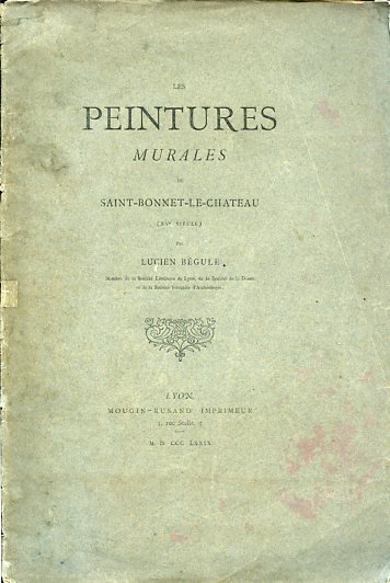 In-8°, pp. 18, brossura editoriale. Un capolettera istoriato e un facsimile n.t. di uno dei dipinti di Saint-Bonnet-le-Chateau. Dedica autografa dell'autore: 'A Monsieur Bernard souvenir amical L. Bégule'. Qualche brunitura lieve. Buon esemplare. Edizione originale. Il Bégule, membro di svariate accademie letterarie e archeologiche, descrive gli affreschi che poté vedere per la prima volta nella loro interezza dopo l'opera di pulitura e restauro che egli aveva intrapreso a partire dal 1878 nei muri della Collegiata di Saint-Bonnet-le-Chateau. <br>