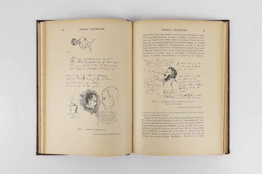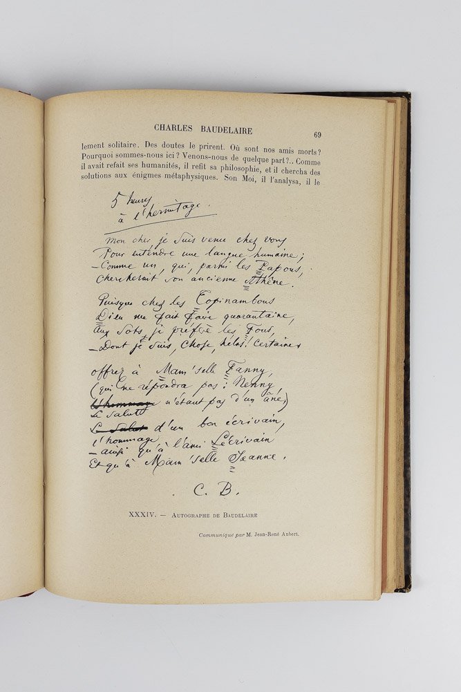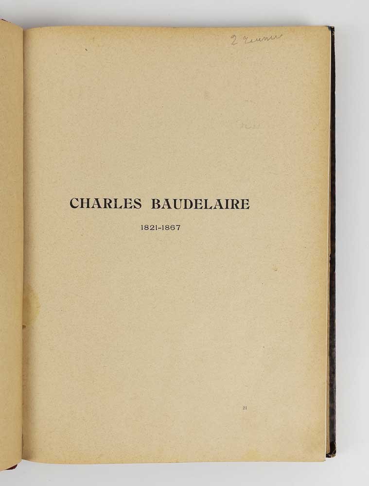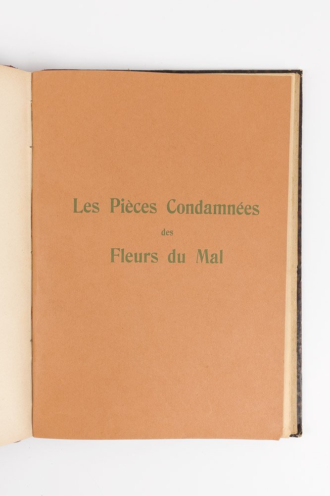 LIBROEdizione di lusso.Più che buon esemplare in discreta legatura, con normali segni del tempo marginali; carte lievemente e uniformemente brunite, ma pulite, senza le frequenti bruniture. Nell’opera di Féli Gautier non presenti il frontespizio, la tavola all’antiporta (la cui immagine è comunque riproposta a p. 89) e le ultime tre pagine peritestuali (97-99).Riunione di due importanti pubblicazioni su Baudelaire promosse dalla rivista «La Plume» nel 1903, in poche copie fuori commercio: la biografia di Féli Gautier, con il suo ricco e scelto apparato iconografico, impressa in soli 150 esemplari numerati (era apparsa a puntate da marzo a giugno dello stesso anno sulla rivista); l’elegante riedizione delle «Pièces condamnées» — ovvero le sei poesie censurate nella prima edizione dei «Fiori del male»: «Les bijoux», «Le Léthé» «À celle qui est trop gaie», «Lesbos», «Femmes damnées» e «Les métamorphoses du vampire» — qui nella tiratura non numerata che affiancò la serie numerata in 41 esemplari. La scelta verosimilmente si deve al fatto che erano trascorsi 41 anni dal 1861, anno dello seconda edizione dei «Fiori del male» in cui le «pièces condamnées» furono scartate. In antiporta, una bella acquaforte di Armand Rassenfosse che raffigura due giovani donne su un letto mentre la morte suona il flauto alle loro spalle. -- Importante momento della ricezione del poeta all’inizio del ventesimo secolo.Talvart & Place, Bibliographie des auteurs modernes de langue française I (Paris 1928), p. 288, n. 13.b; Vampiri: illustrazione e letteratura, Crema 2024, p. 145 n. 64 tav. 81