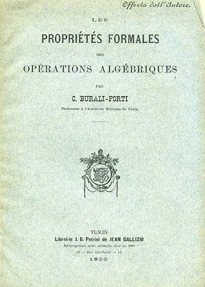 In-8°, pp. 40, brossura editoriale con dicitura a stampa: 'Offerta dall'Autore'. Ottimo stato. Estratto dalla 'Revue de Mathématiques' diretta da Peano, tomo VI, 1899. Su Burali-Forti: Kennedy, pp. 122 e sgg. Bibliotheca Mathematica, pp. 180-181. D.S.B., II, 593-594. D.B.I., XV, pp. 376-381.