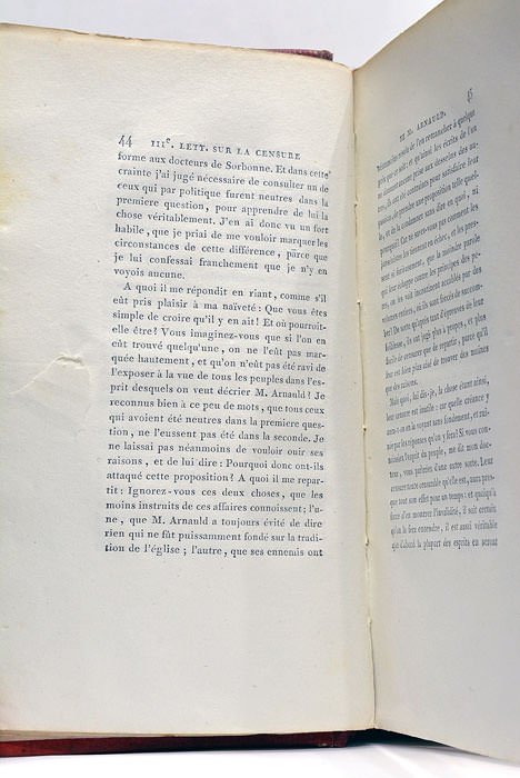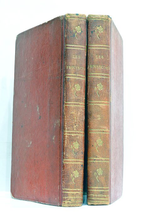 2 volumes. 2 feuillets. 254 pages.; 2 feuillets. 291 pages. (18,5x10,5 Cm). Demi maroquin rouge. Dos lisse orné. Reliure de l'époque. Coins et coiffes émoussés. Dos et plats frottés. Elégante édition des "Provinciales", sortie de l'imprimerie de Renouard. Un des exemplaires sur papier vélin, enrichi d'un portrait. Bon exemplaire. Petit accrocs page 44 du premier tome. Rousseurs éparses.